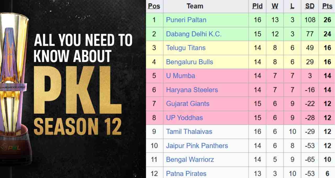 পয়েন্ট টেবিলে পুনেরি পল্টন দুর্দান্ত পারফরম্যান্স করে টপ-2-এ নিজেদের জায়গা করে নিয়েছে। এই মরসুমে তাদের ধারাবাহিক জয় এবং শক্তিশালী দলীয় কাঠামো তাদের সরাসরি ফাইনালের দৌড়ে এনে দিয়েছে। অন্যদিকে, অন্যান্য দলগুলির জন্য প্লে-অফ যোগ্যতার দৌড় এখনও চলছে। দলগুলির বর্তমান ফর্ম এবং পয়েন্ট টেবিলের অবস্থান নিম্নরূপ (87টি ম্যাচের পর):