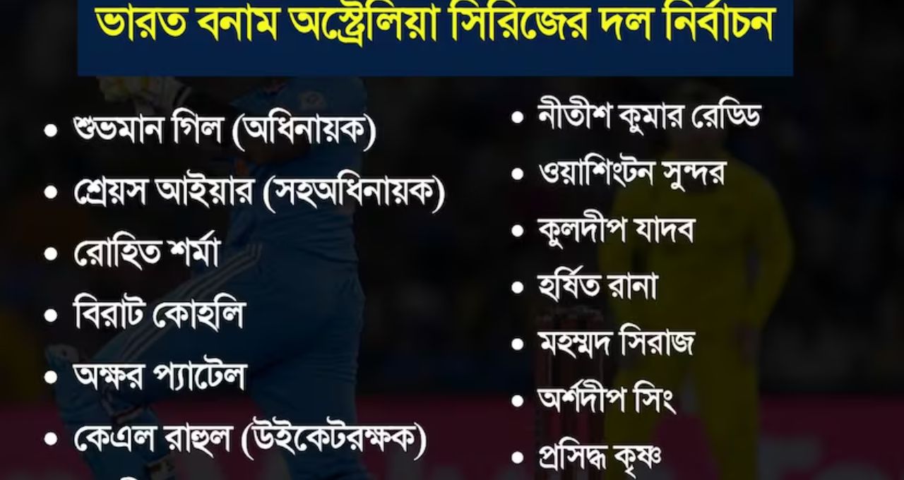 Ind vs Aus ODI Series: ভারতীয় ক্রিকেট নির্বাচক কমিটি শুক্রবার ভারত-অস্ট্রেলিয়া ওয়ানডে সিরিজের দল ঘোষণা করেছে। নেতৃত্বে এবার বড় পরিবর্তন—রোহিত শর্মার জায়গায় অধিনায়ক নির্বাচিত হয়েছেন শুভমান গিল। রোহিত ও বিরাট কোহলি সাত মাস পর দলে ফিরলেও এইবার শুধুই ব্যাটার হিসেবে খেলবেন। নির্বাচক অজিত আগরকরের নেতৃত্বাধীন কমিটি জানিয়েছে, কাজের চাপের কথা মাথায় রেখে জসপ্রীত বুমরাহকে বিশ্রাম দেওয়া হয়েছে। চোটের কারণে দল থেকে ছিটকে গেছেন হার্দিক পাণ্ডিয়া ও ঋষভ পন্থ।